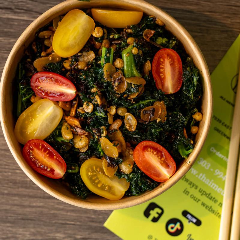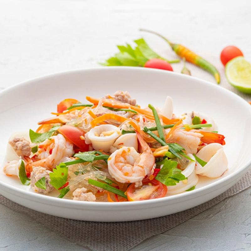 Traditional Thai spicy glass noodle, Fresh lime juice sauce with fresh Thai chili. It's mixed with broccoli, collard, yellow onion tomato, green onion. Serve with choice of protein.