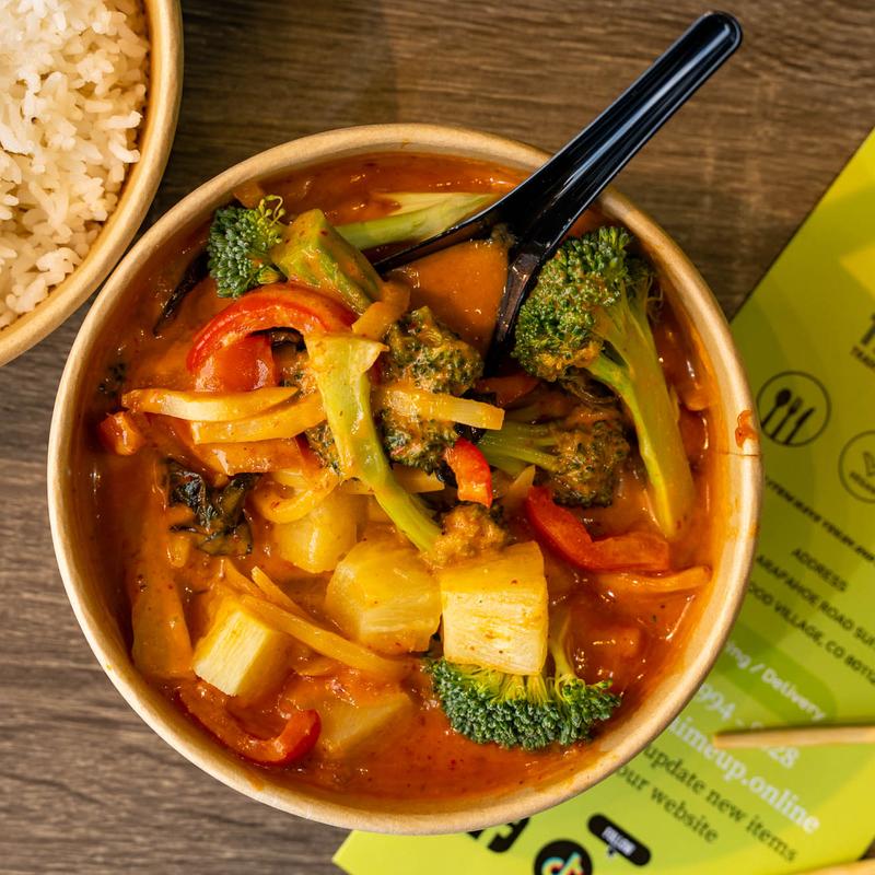 A comforting Thai yellow curry simmered with pumpkin, sweet pineapple, broccoli, and carrot, with your choice of protein and jasmine rice on side